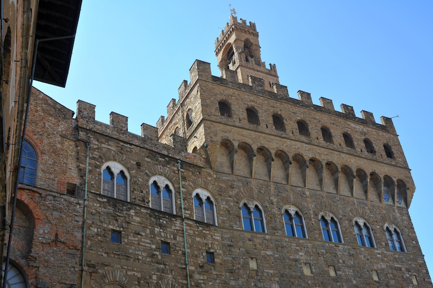 穿過巷弄,看見了 [舊宮 (Palazzo Vecchio)] 。