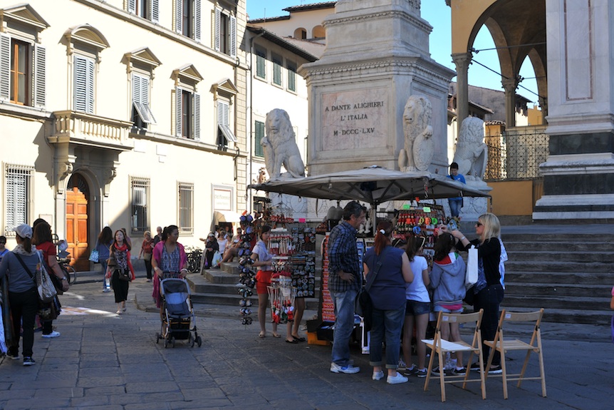我們從側翼走入了 [聖十字廣場 (Piazza Santa Croce)],她是一個面積較大、是佛羅倫斯節慶、競賽以及表演活動的一處大型場地。
