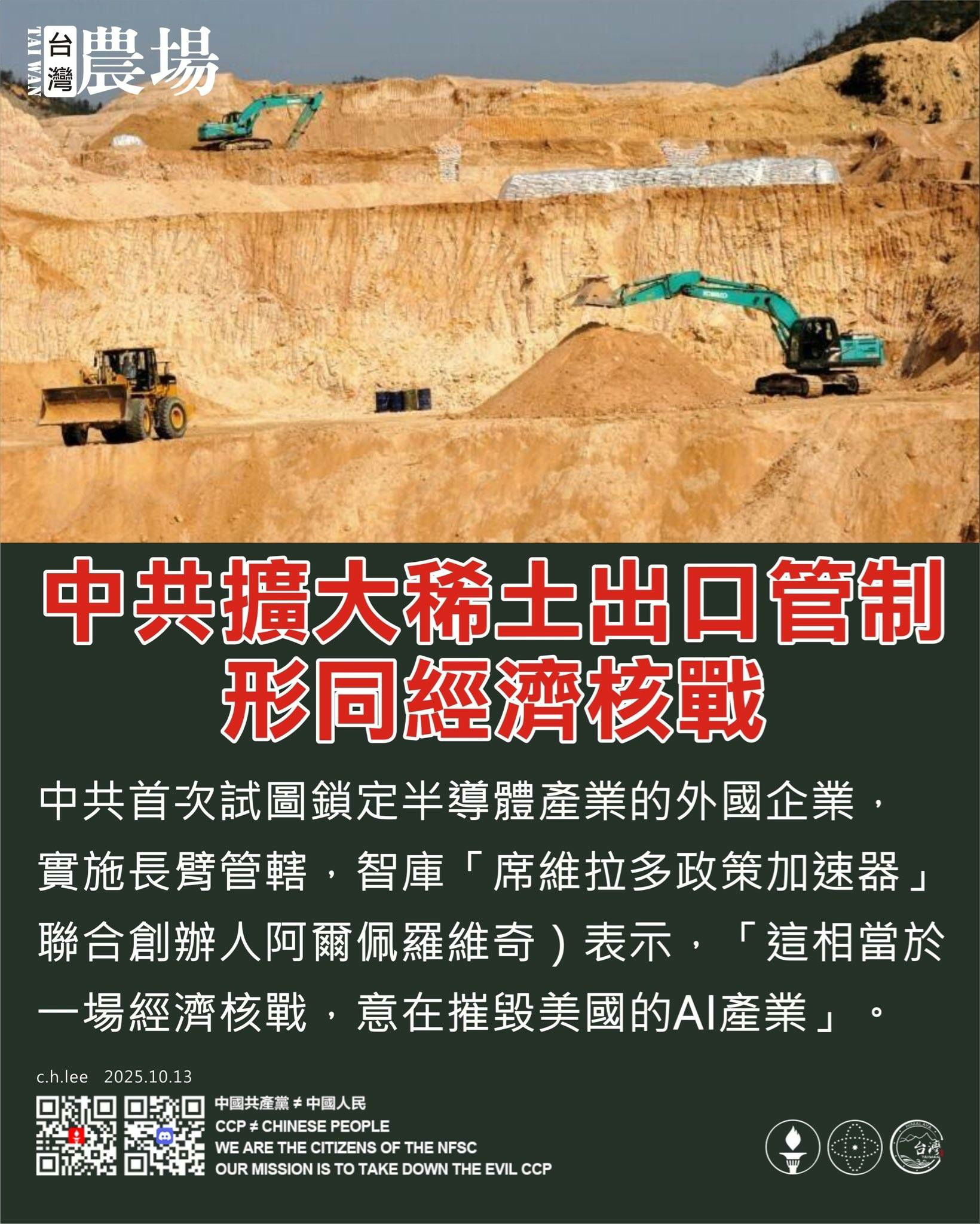 中國日前公布稀土管制新規,對任何一家境外公司銷售的商品中,從中國採購的某些稀土材料佔產品價值0.1%以上,該公司就需取得中國政府的許可。智庫「席維拉多政策加速器」聯合創辦人Dmitri Alperovitch稱「這相當於一場經濟核戰,意在摧毀美國的AI產業」(註1)。