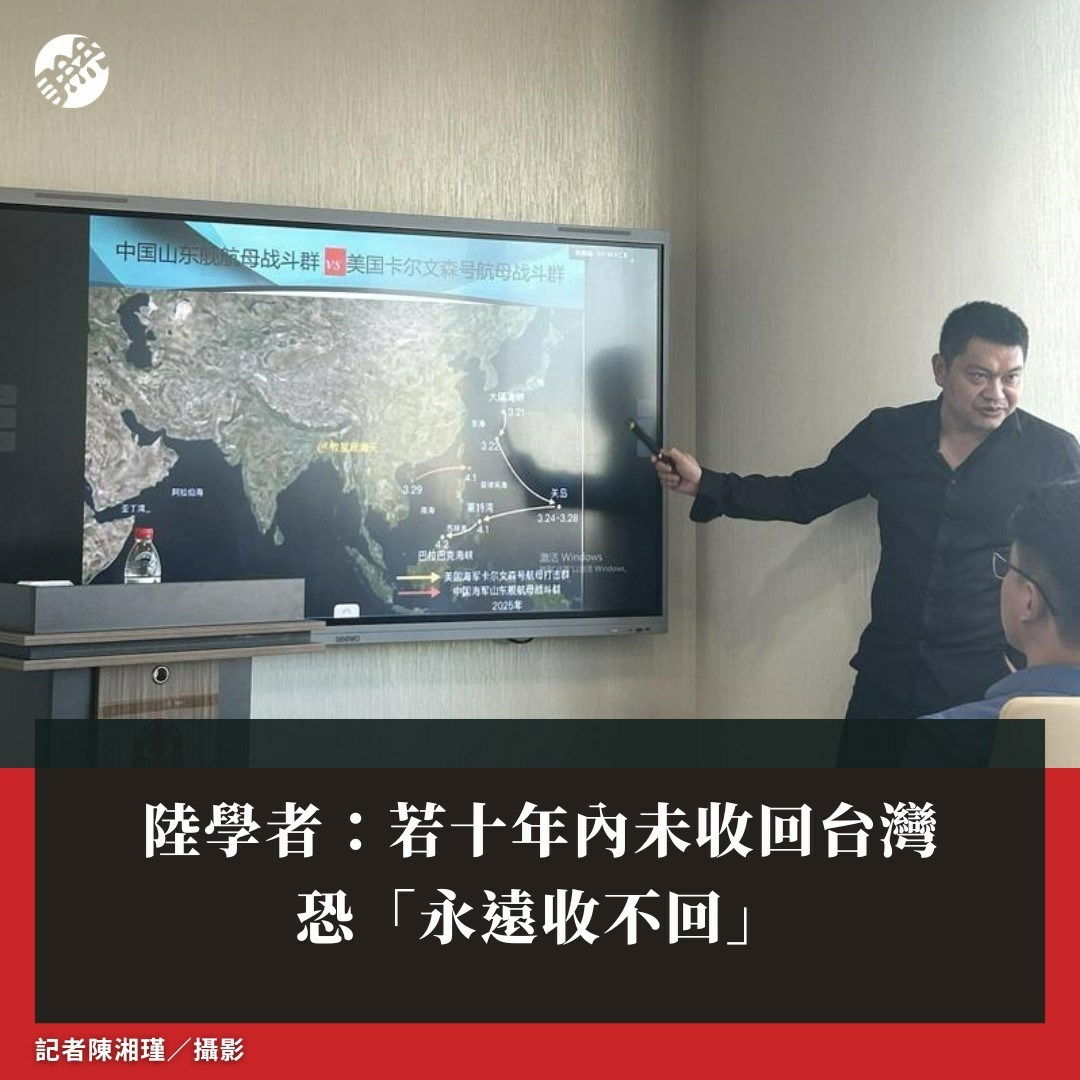 而中國廈門大學法學院教授魏磊杰近日在上海一場講座上也指出,中美關係已發生質變,對華強硬成為美國朝野共識。他還說:「未來十年若大陸沒有收回台灣,可能永遠就收不回。」,因為「當年隨蔣介石到台灣的外省人,經過七十幾年至今已經凋零殆盡,幾代下來,台灣新世代的中華認同已經非常少了。」(註2)